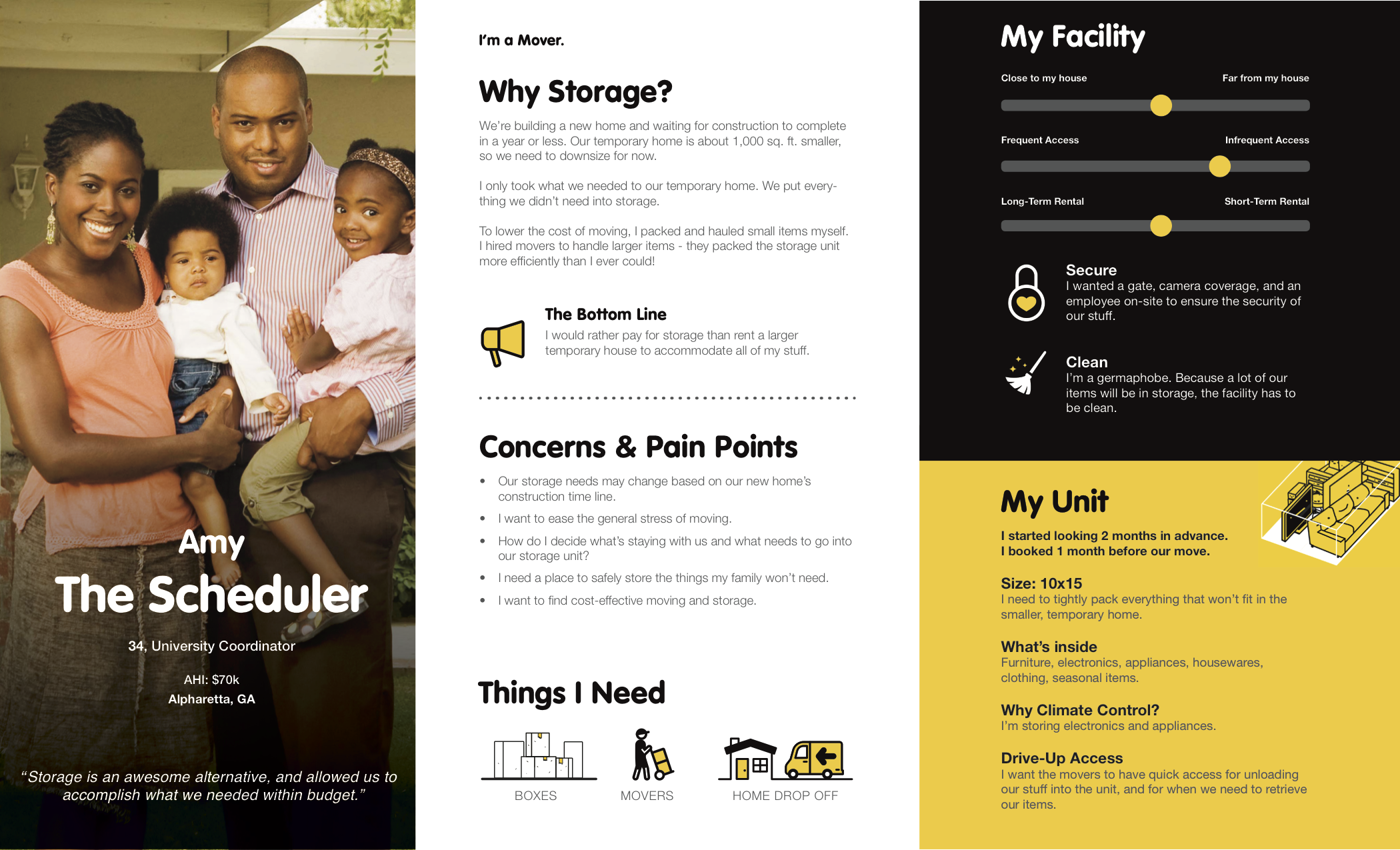 What I found among these two groups is that all had been motivated to use storage because of a move. So all personas were movers, but their constraints and needs varied. Altogether, there were 4 personas, split into 2 groups: convenience-oriented and budget-oriented. Among other things, this defined what kind of services they would be motivated to engage in.
