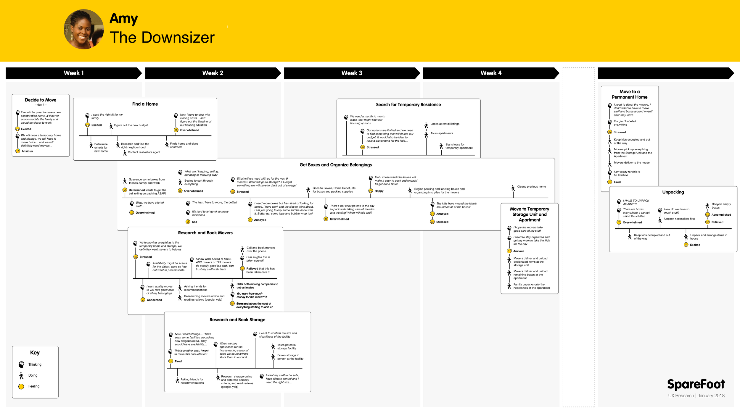 This was such an important process for the company that had previously been unable to understand their consumers. Among other things, this process exposed that the current experience focused very hard on getting reservations, but once the consumer left the site, SpareFoot did not do a good job of supporting the successful completion of moving into a storage unit, much less getting the consumer to engage in other services we offered. The journey maps did a fantastic job of highlighting these gaps to stakeholders and getting them thinking about opportunities for a better consumer experience.